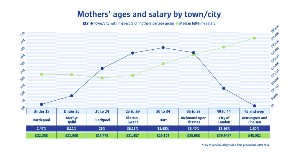 In line with the theory that the richer you are, the greater job prospects you have (/the further South you are), the older you are to have children, according to data from Comparethemarket.com, Kensington & Chelsea, the richest local authority area in the UK, (where residents earn three times the national average, £64,868 per head), have the oldest mothers in the UK. At the other end of the scale sits Hartlepool. With an average salary per head of £25,000, Hartlepool has the youngest mothers in the UK.